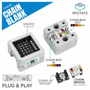 The Chain Blank is a Proto Board DIY expansion node in the M5Stack Chain series. On the front, it features an 18 × 18 mm universal prototyping area 🧩, perfect for building custom circuits. Inside, the PCB comes pre‑soldered with two interconnected HY2.0‑4P connectors 🔌, allowing seamless daisy‑chaining with other M5Stack Chain devices without affecting their original functionality.