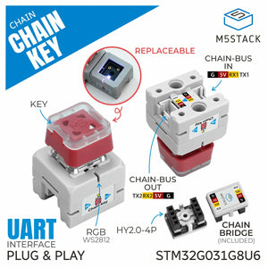 Powered by the STM32G031G8U6 core MCU ⚡, the Chain Key communicates via UART cascading protocol, ensuring seamless integration with other Chain series modules. With two HY2.0-4P expansion interfaces, users can easily extend functionality and build complex, scalable systems for smart home control 🏠 and human-machine interaction 🤝.