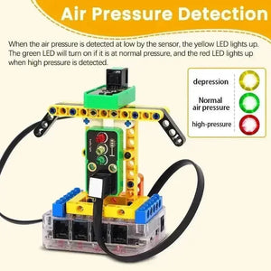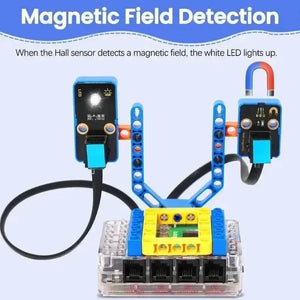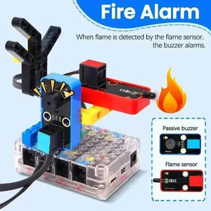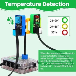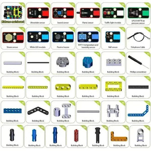 In this kit, multiple sensors and modules are included: white LED module, Hall sensor, passive buzzer, XH11 temperature and humidity sensor, steam sensor, flame sensor, sound sensor ultraviolet sensor, traffic light module and air pressure sensor. Besides, we design seven comprehensive experiments for the kit with building blocks: rain detection, fire alarm, magnetic field detection, thunder detection, temperature detection, ultraviolet detection and air pressure detection. These building blocks are provided, so you may design forms at will, which greatly improves logical analysis, creativity, hands-on skills and problem-solving ability.