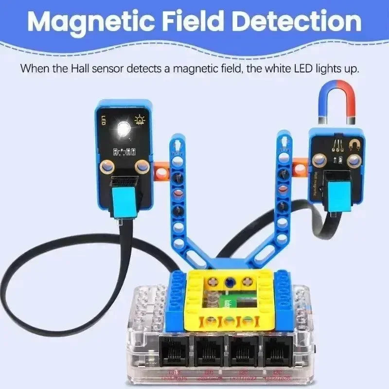 In this kit, multiple sensors and modules are included: white LED module, Hall sensor, passive buzzer, XH11 temperature and humidity sensor, steam sensor, flame sensor, sound sensor ultraviolet sensor, traffic light module and air pressure sensor. Besides, we design seven comprehensive experiments for the kit with building blocks: rain detection, fire alarm, magnetic field detection, thunder detection, temperature detection, ultraviolet detection and air pressure detection. These building blocks are provided, so you may design forms at will, which greatly improves logical analysis, creativity, hands-on skills and problem-solving ability.
