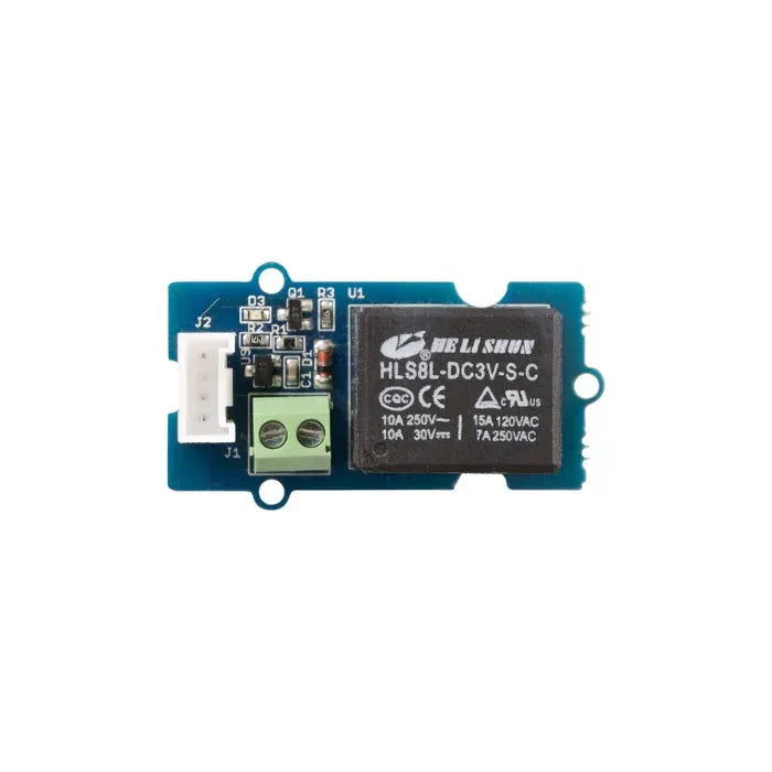 The Grove-Relay module is a digital normally-open switch that can handle the current up to 5A at 250VAC for long periods of time. When the relay is switched on, the LED will light up and the relay will allow current to flow. The peak voltage capability is 250V at 10A. It is widely used in remote control, telemetry, communication, automatic control, mechatronics, power electronics and other fields.
