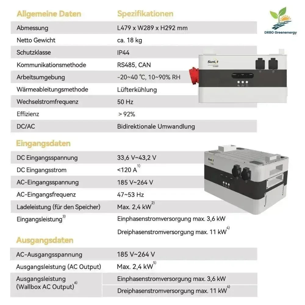 The EV3600 impresses with its innovative bidirectional charging function. It not only enables the use of stored energy but also the charging of the energy storage system via the household grid - ideal for saving costs in times of low electricity prices. Two 230-volt connections offer flexible options for supplying power to household appliances with an output of up to 2400 watts. In addition, a special connection for the Sunlit Aurora Wallbox is integrated, which enables an output of 3.6 kW. This makes the EV3600 the ideal solution for combining solar power and electromobility.