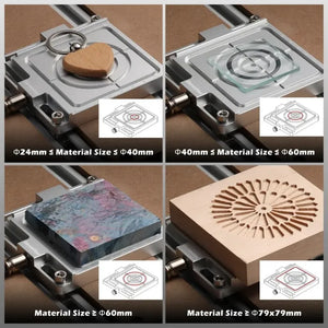 Securely grips workpieces from a 24 mm coin to a 90 mm wooden block using a vacuum pump. Eliminates clamp searching and preserves 100% engraving area.
