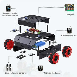 Hjulsdrift med Mecanum-hjul: mBot Mega är utrustad med 4 DC-motorer och Mecanum-hjul, vilket möjliggör rörelse i alla riktningar. Denna funktion tillåter avancerat lärande i robotrörelsealgoritmer, såsom rörelse i alla riktningar och mer flexibla manövrar, vilket gör den idealisk för praktiska projekt och robotikutbildning.