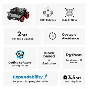 Utforska lärorik underhållning i flera funktioner: hinderundvikande, linjeföljning och fjärrkontroll.