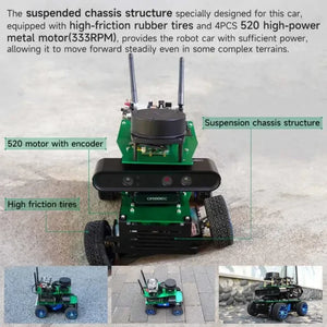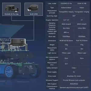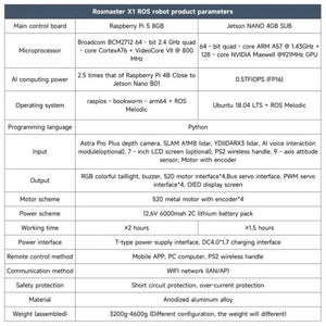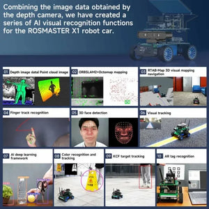 ROSMASTER X1 är en fyrhjulsdriven mobilrobot baserat på ROS (Robot Operating System) ramverk, med en hängande fjädringschassi. Den stöder Jetson NANO och Raspberry Pi 5 utvecklingskort och är utrustad med högpresterande hårdvara, inklusive LiDAR och en djupkamera. Dessa komponenter möjliggör funktioner såsom rörelsekontroll, fjärrkommunikation, kartläggning och navigering, följning och hinderundvikande, självkörning, och kroppsfunktionsigenkänning. Dessutom stöder X1 flera fjärrkontrollmetoder, inklusive en app, en handhållen kontroll, och en dator-tangentbord. Vi tillhandahåller också många undervisningsvideor med Kinesiska och engelska undertexter för att hjälpa användare att snabbt lära sig ROS och Python-programmering.