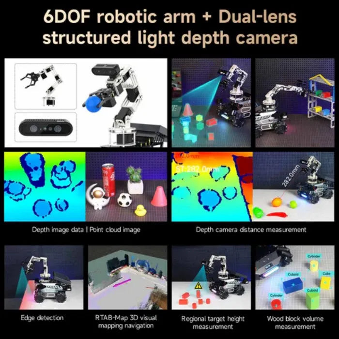 • In combination with a depth camera and a 6DOF robotic arm, enabling 3D grasping, precise handling, and MoveIt simulation. Four TOF ranging LiDARs front left and rear right provide 360° scanning, improving mapping and navigation accuracy.
